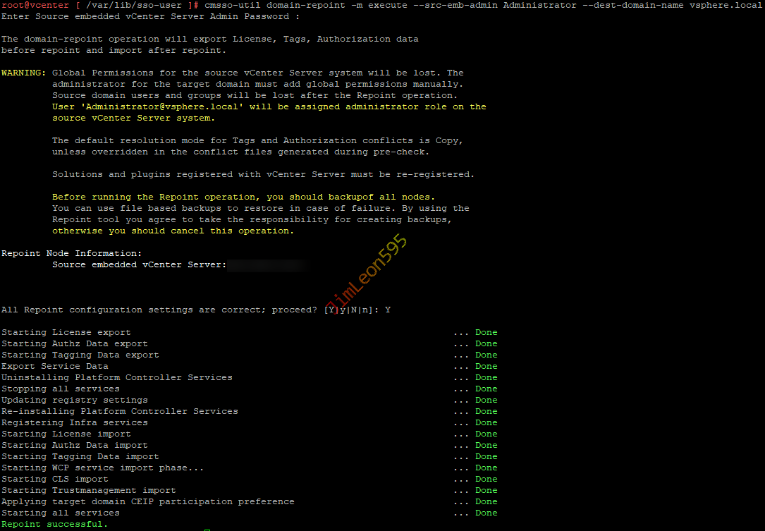 1 | cmsso-util domain-repoint -m execute --src-emb-admin Administrator --dest-domain-name vsphere.local |