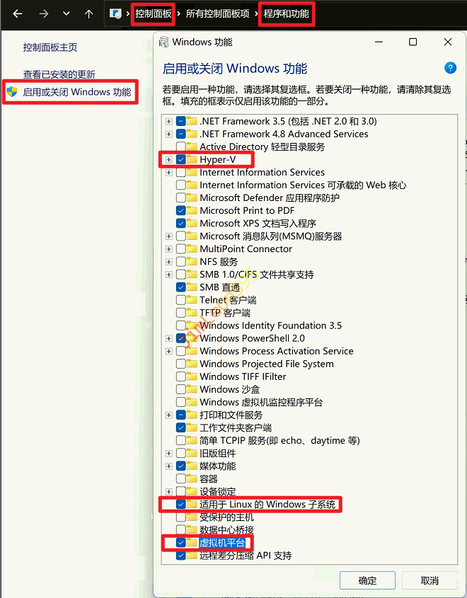 控制面板 --> 程序和功能 --> 启用或关闭Windows功能