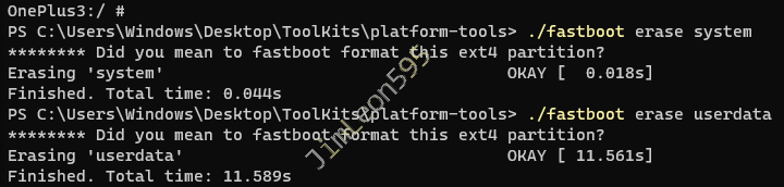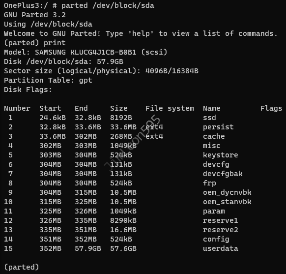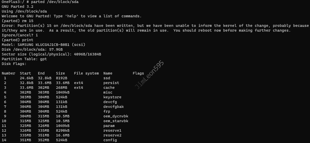 | # 进入 sda 分区 parted /dev/block/sda # 删除 userdata 分区 rm 15