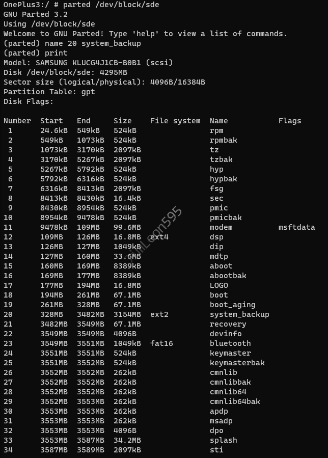 | # 进入 sde 分区 parted /dev/block/sde # 修改 system 分区名 name 20 system_backup # 输出 sde 分区情况 print
