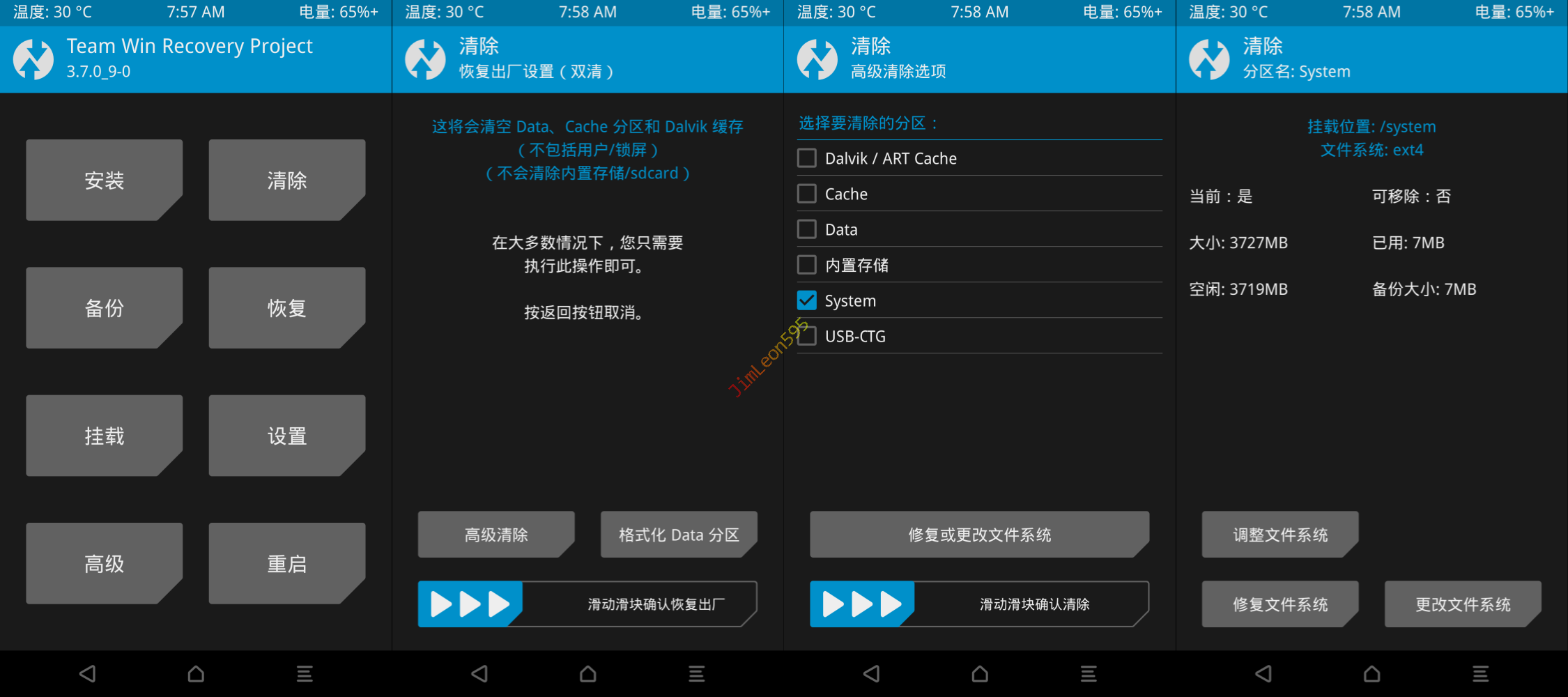 | # 进入 sda 分区 parted /dev/block/sda # 创建 userdata 分区 mkpart userdata ext4 352MB 53.9GB # 创建 system 分区 mkpart system ext2 53.9GB 57.9GB