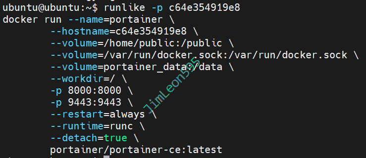| sudo docker run --name=<New_Name> \ --hostname=<CONTAINER_ID> \ --volume=/home/public:/public \ --volume=/var/run/docker.sock:/var/run/docker.sock \ --volume=portainer_data:/data \ --workdir=/ \ -p 8000:8000 \ -p 9443:9443 \ --restart=always \ --runtime=runc \ --detach=true \ portainer/portainer-ce:latest