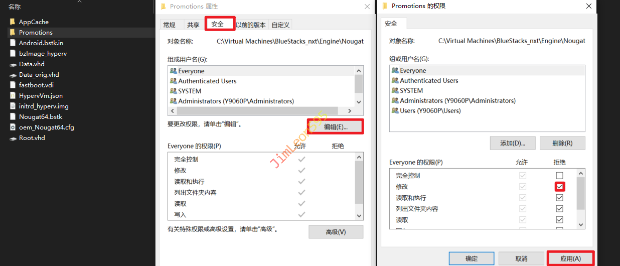 属性 --> 安全 --> 编辑 --> 修改-拒绝 --> 应用