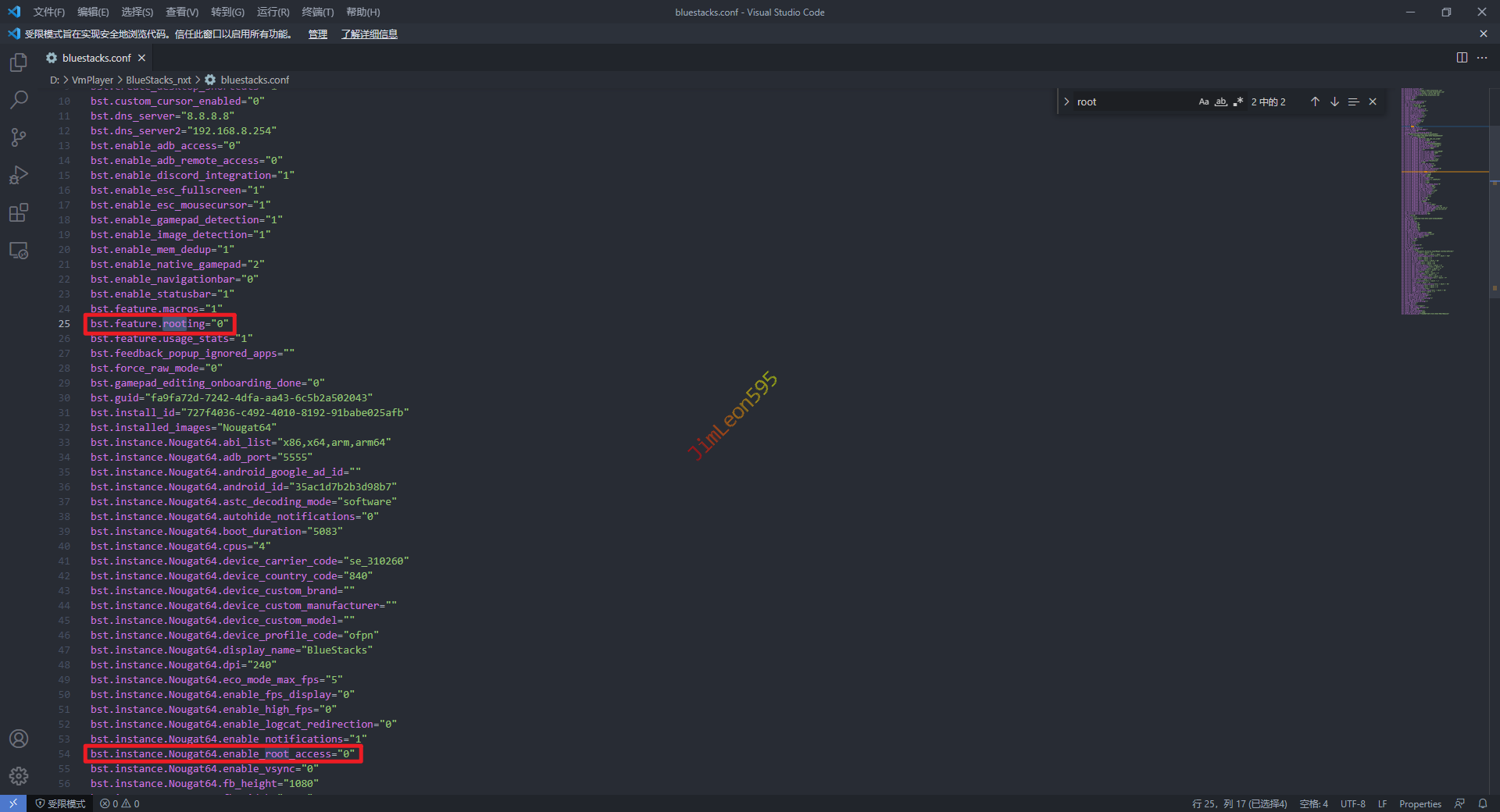 用文本编辑器打开bluestacks.conf搜索关键词root