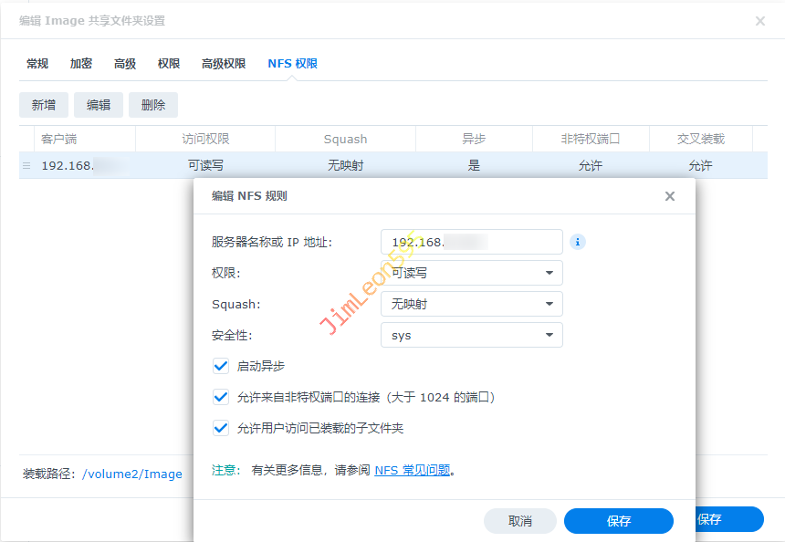 • NFS 共享 填写 Synology NFS 文件夹地址