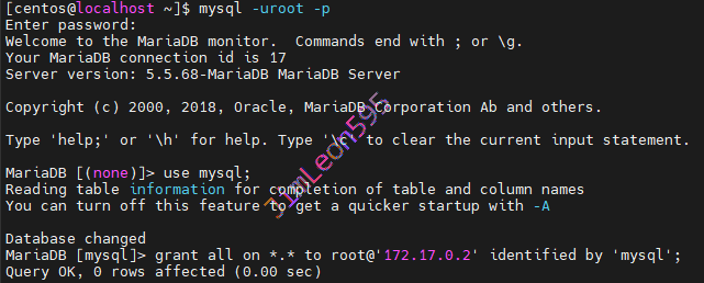 grant all on *.* to root@'172.17.0.2' identified by 'mysql';