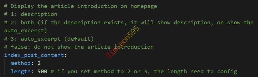# 1. description: 只显示description # 2. both: 优先选择description,如果没有配置description,则显示自动节选的内容 # 3. auto_excerpt: 只显示自动节选 # 4. false: 不显示文章内容 # 主题文章节选 index_post_content: method:2 length:500# if you set method to 2 or 3, the length need to config