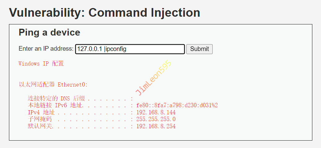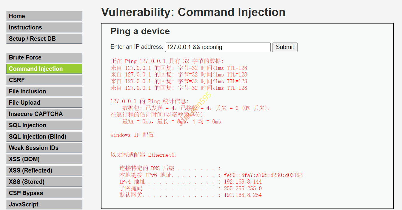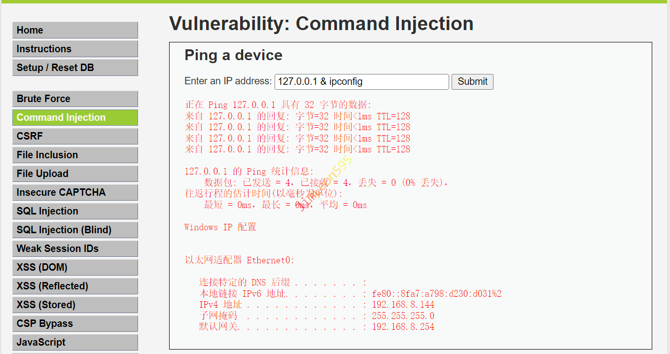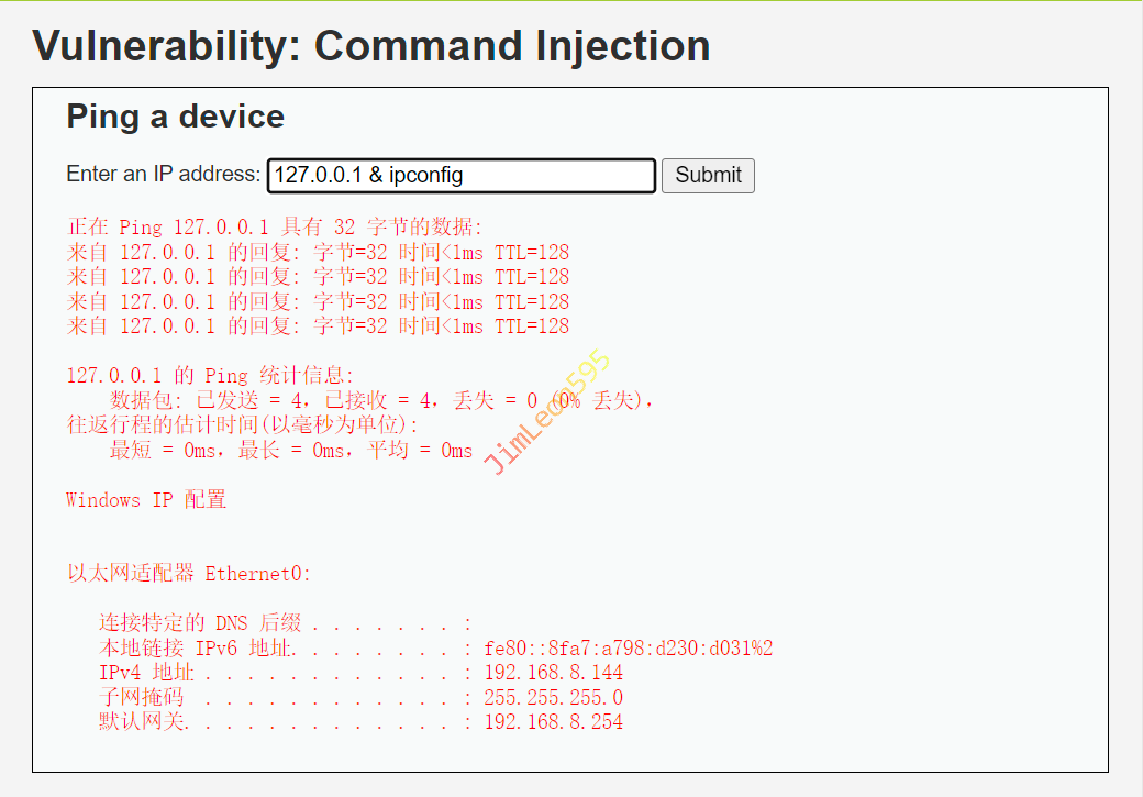 所以我们还是直接使用 127.0.0.1 & ipconfig 进行绕过