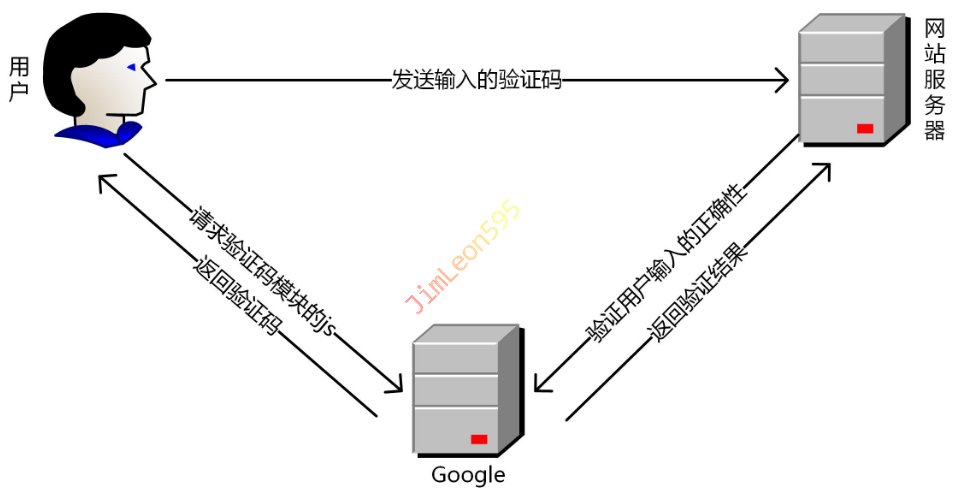 用户输入验证码发送数据回去,这里发给的是访问网站的服务器,网站的服务器拿到验证码后,再去访问谷歌的服务器,谷歌的服务器会判断验证码是否正确,再将结果返回给网站服务器。